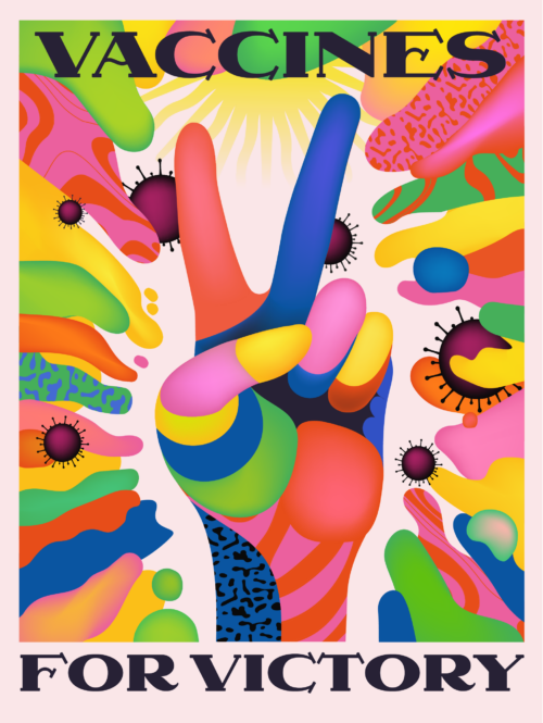 Victory gesture to represent the 'V' for vaccines. It's a lighthearted and colourful celebration of the vaccinations overwhelming efficacy and it's ability to tackle this virus and get us back to some sort of normality if enough people around the world are vaccinated! I for one can't wait to see the back of this pandemic..bring back the hugs!